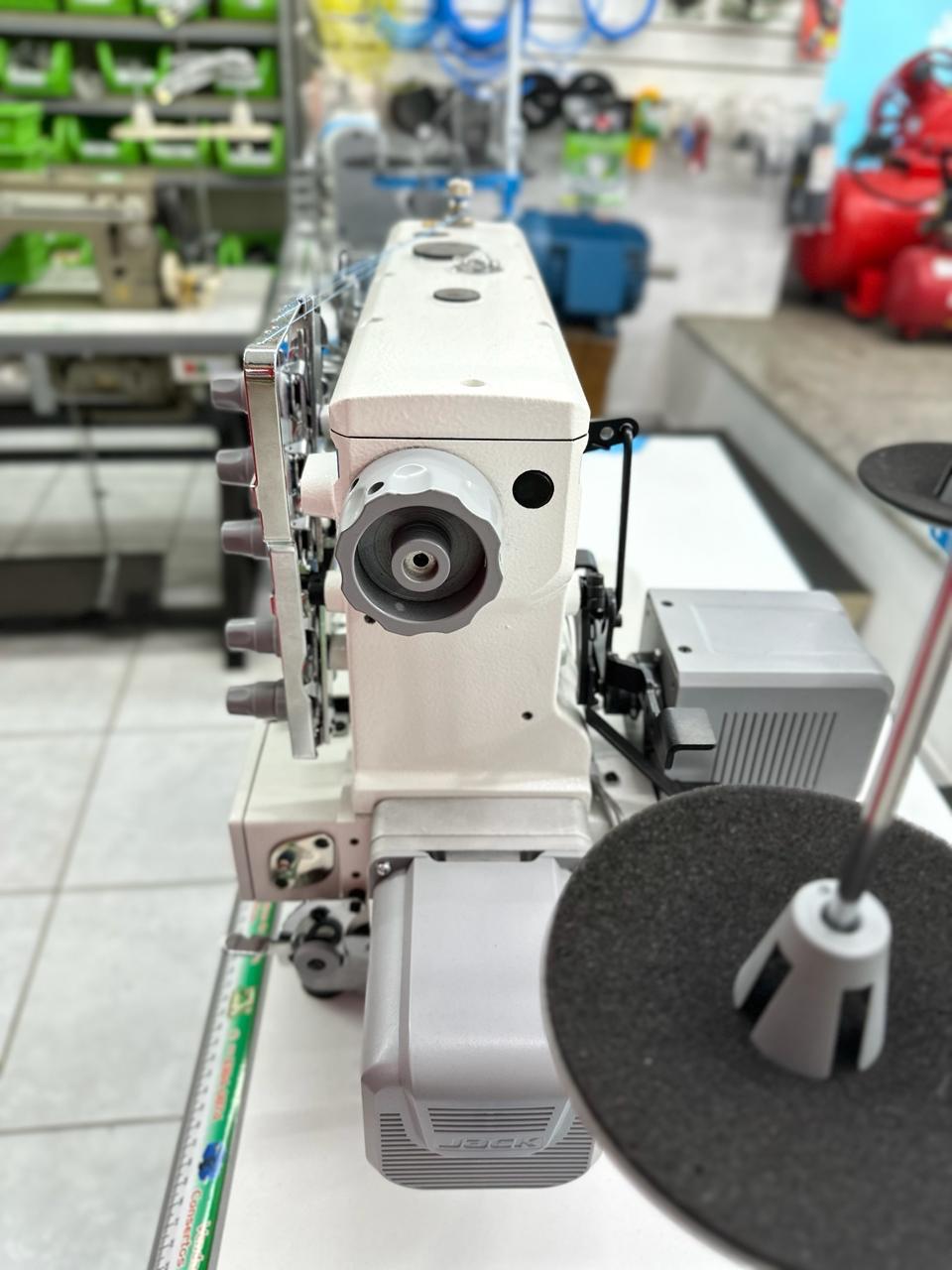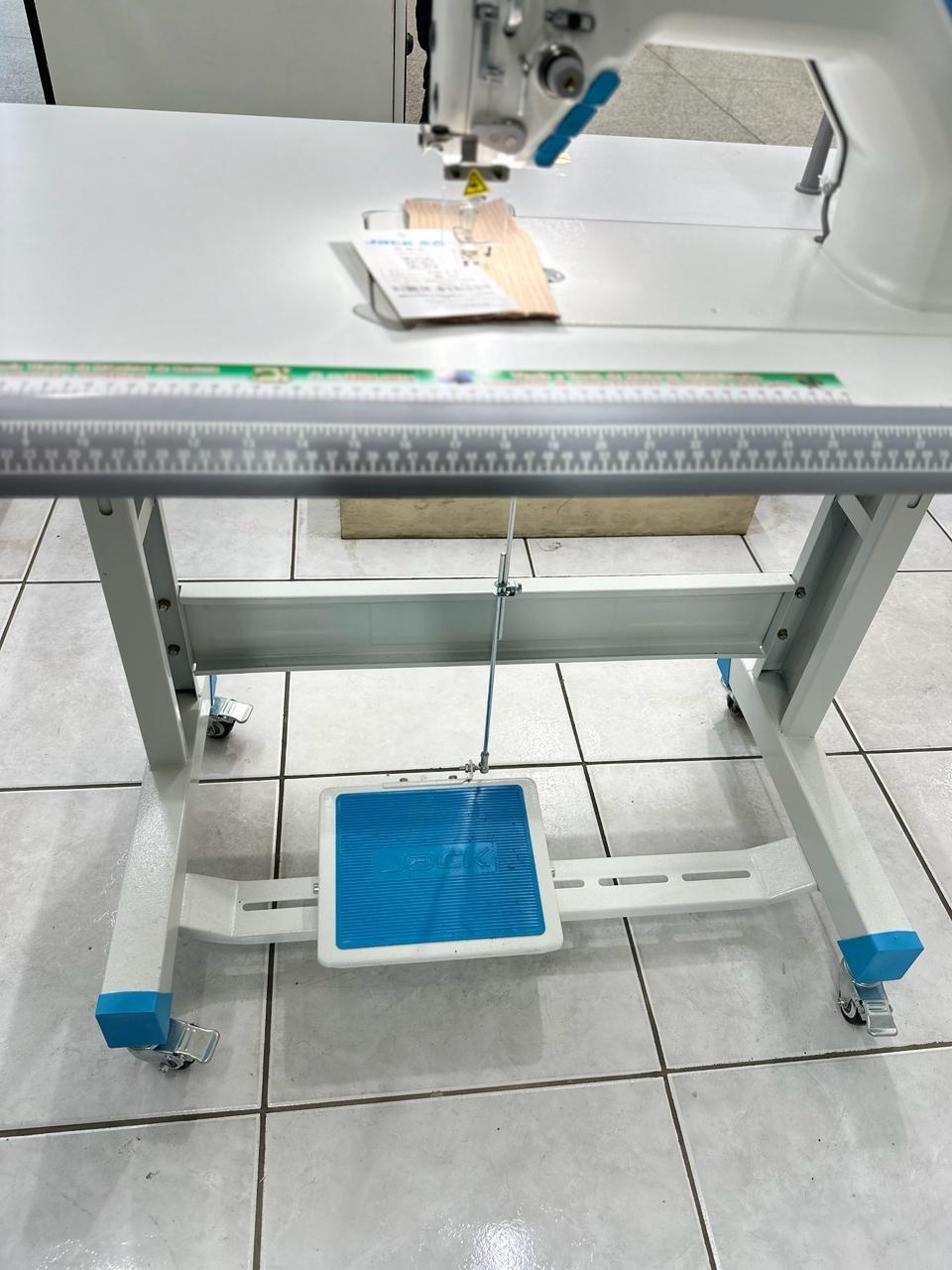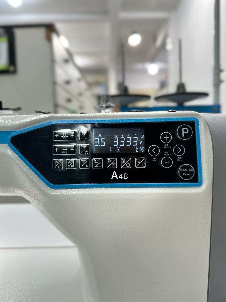 Máquina industrial eletrônica de alta velocidade com motor Direct Drive integrado. Equipada com posicionador de agulha e regulagem de velocidade digital.