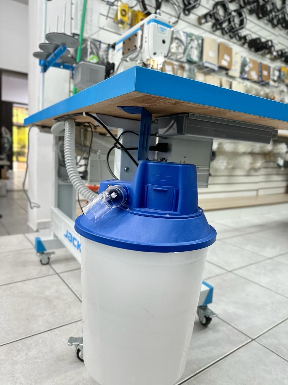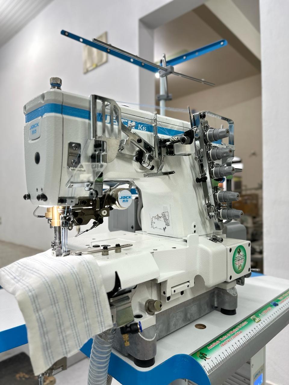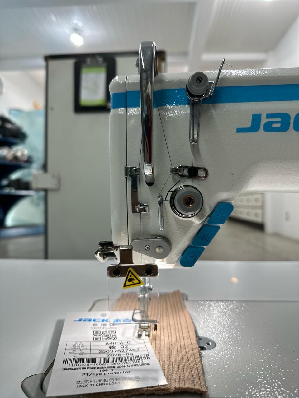 Máquina industrial eletrônica de alta velocidade com motor Direct Drive integrado. Equipada com posicionador de agulha e regulagem de velocidade digital.